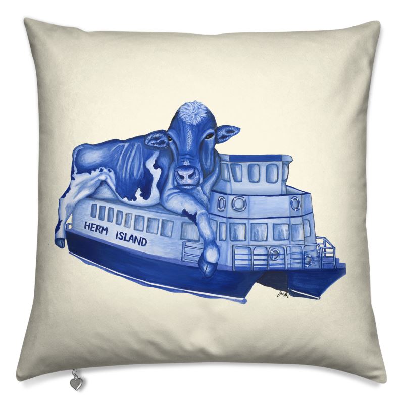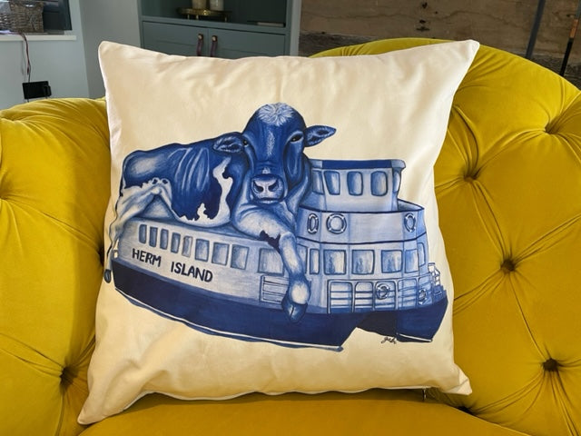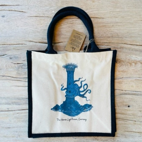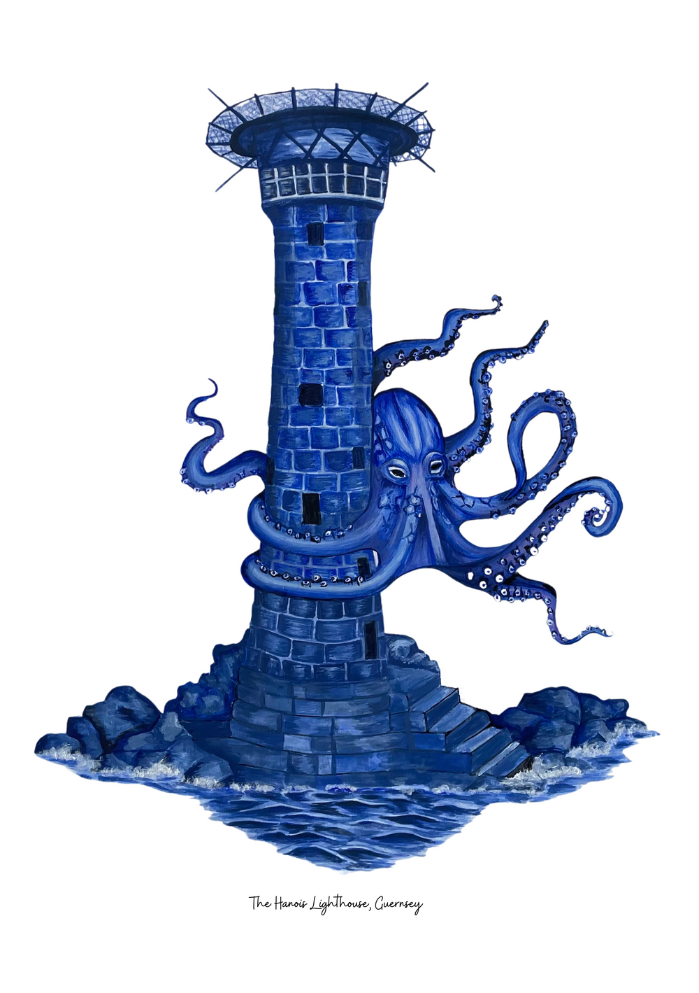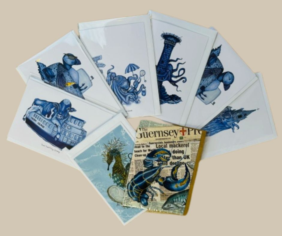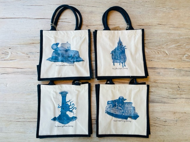 Quirky hand painted illustrations of local iconic buildings and animals.  From original acrylic paintings by local artist Gabi Nobes.  These designs were inspired by a childhood spent outdoors at Pleinmont and Rocquaine.  Innocent days climbing cliffs, picking blackberries, agricultural shows, Herm adventures and sea jumping at 'The Cup'.